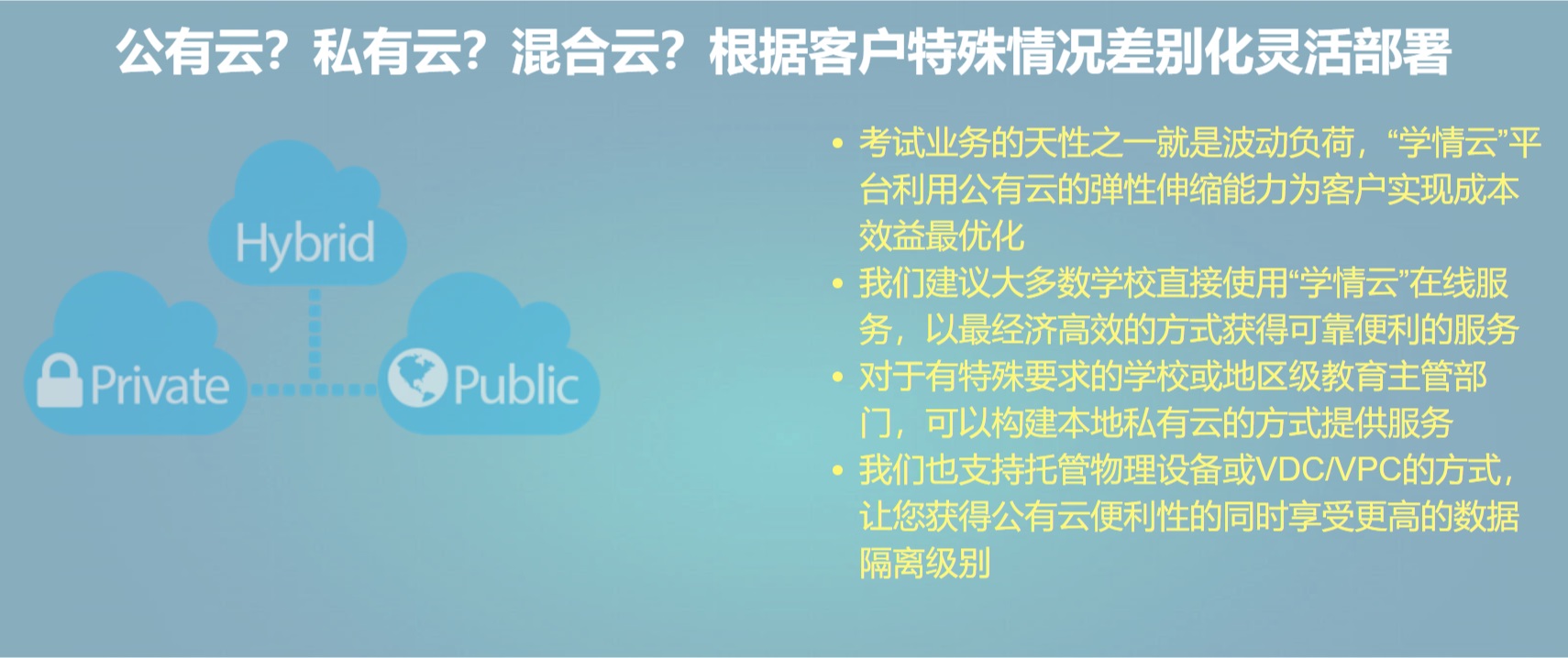 我们为客户在当地指定数据中心构建标准化私有云基础设施,部署学情云平台,提供上述资源的运营维护服务,提供考试实施服务。 辖区内的所有学校皆可同步获得校内实施考试业务的能力,无需重复采购,同时可以即时透视辖区内所有学校的第一手学业测量数据,消除导出、导入和申报的漫长周期和数据质量隐患。 典型客户:省市县区各级教育主管部门、举办大规模联考的民营教研机构、集团校。